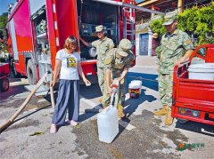 7月23日,火箭军工程大学官兵为水泉子村送水。解放军报特约记者钟福明摄日头火辣辣的,陕西省西安市灞桥区水泉子村村民窦栓美却不在屋里避暑,反倒站在院门口张望。近来西安持……